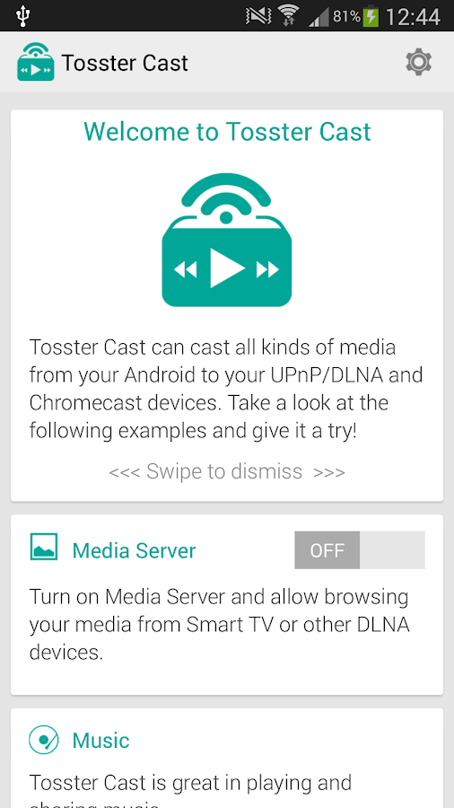 Transmita suas músicas, fotos e vídeos para o seu DLNA Smart TV ou Chromecast via Wi-Fi usando Tosster Cast. Tosster também é grande em streaming de vídeos do YouTube e Vimeo para dispositivos DLNA .